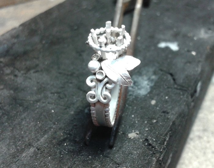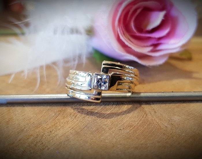Hier zie je een veel voorkomend probleem van een ring met een steen die steeds draait aan je vinger. Wij lossen dat op d.m.v. kantelbolletjes erin te solderen.